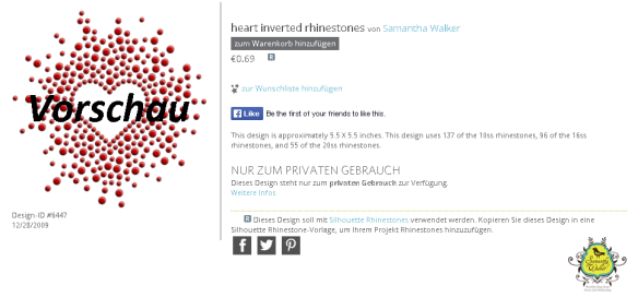Strassstein Vorlagen kann man sich ganz einfach über den Silhouette Design Store kaufen. Um diese Vorlagen zu finden, müsst Ihr das Englische Schlagwort „Rhinestone“ in das Suchfeld im Design Store eingeben. Dann werden Euch alle Strassstein Vorlagen angezeigt. Sucht Euch hier nun einfach eine Vorlage, die Euch gefällt aus. Wie bei allen anderen Dateien aus dem Design Store auch, müsst Ihr die Datei natürlich erst kaufen und anschließend in die Bibliothek laden.