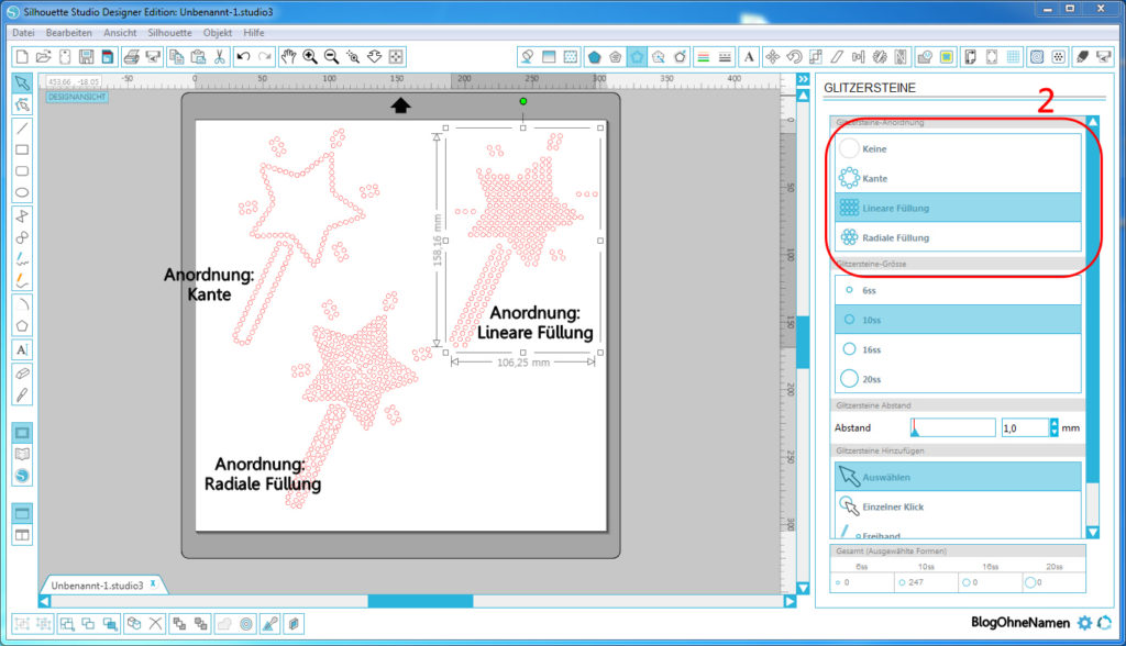 Unter dem Punkt „Glitzerstein-Anordnung“ könnt Ihr nun entscheiden, wie die das Motiv später aussehen soll. Möchte man nur die Außenlinie als Kontur festlegen, dann klickt man auf „Kontur“(2). Klickt Ihr auf „Lineare Füllung“(2) (die Flächen für die Strasssteine werden an unsichtbaren waagerechten und senktrechten Linien ausgerichtet) oder „Radiale Füllung“ (2) (die Flächen für die Strasssteine werden an einem unsichtbaren Kreisförmigen Linien ausgerichtet) dann wird das Motiv automatisch ausgefüllt.