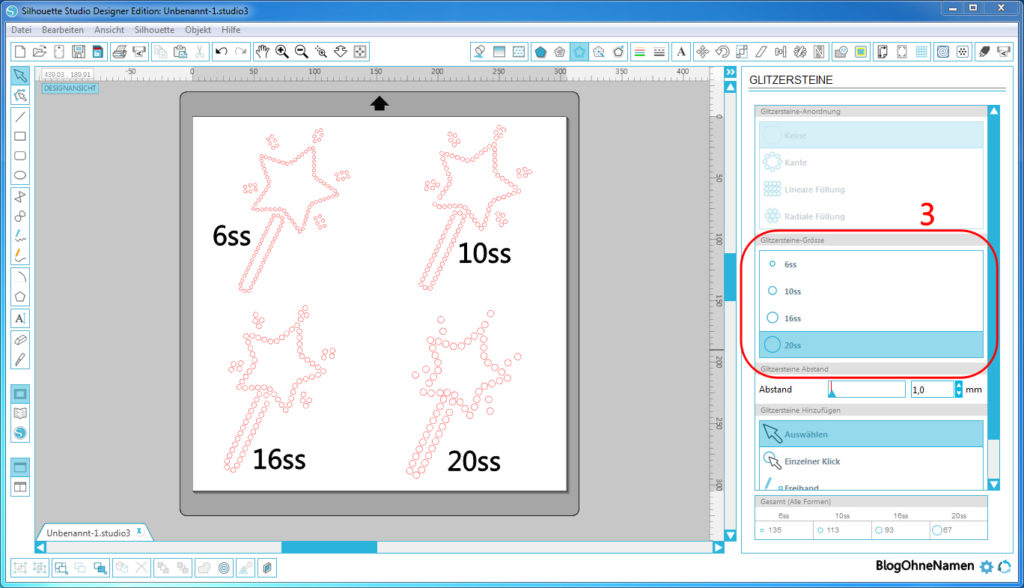 Dafür kann man aber die gewünschten Steine auswählen (Strg+Rechtsklick auf den Kreis) und diese über die Option „Glitzerstein-Größe“ (3) vergrößern oder verkleinern. So habt Ihr eine weitere Möglichkeit ein Motiv für Euch zu individualisieren.