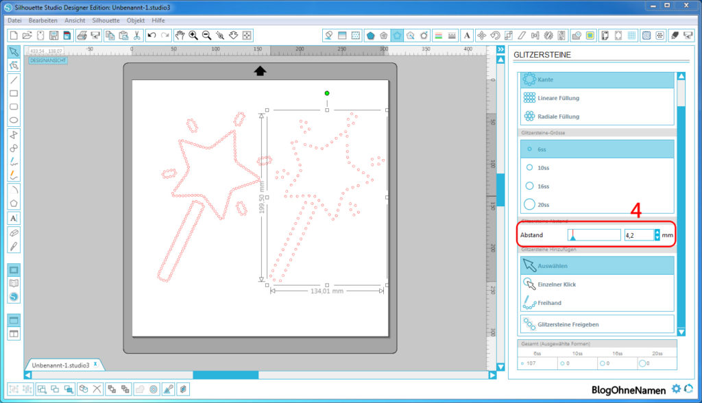 Mit Hilfe des Abstandes (4) kann man dann noch den Abstand von Stein zu Stein einstellen. So hat man die Möglichkeit die Strassstein – Vorlage an seine Wünsche anzupassen.