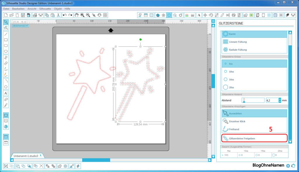 Sollte das Motiv mal nicht so werden, wie man es vielleicht mag, dann kann man das ganze natürlich auch ein bisschen bearbeiten. Mit der Funktion „Glitzersteine freigeben“ (5) könnt Ihr die Steine ganz einfach frei bewegen, entfernen oder verschieben. (Natürlich auch hinzufügen. Dafür gibt es die Funktion „Einzelner Klick“)