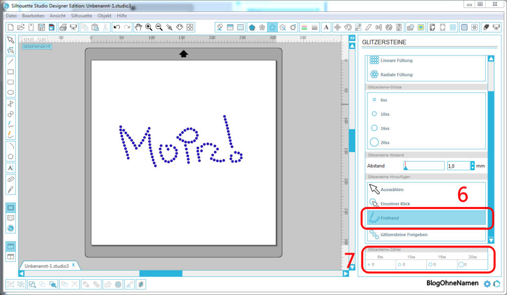 Mit der Funktion „Freihand“ (6) kann man sein Strass-Motiv ganz einfach freihändig „zeichnen“. Ich kann das leider nicht – mir fehlt dafür jegliches Talent. *g* Besonders praktisch: Der Glitzerstein-Zähler (7). So kann man am Ende sehen, wie viele Steine der Größe X für das Projekt gebraucht werden.