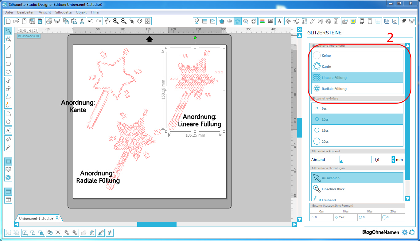Unter dem Punkt „Glitzerstein-Anordnung“ könnt Ihr nun entscheiden, wie die das Motiv später aussehen soll. Möchte man nur die Außenlinie als Kontur festlegen, dann klickt man auf „Kontur“(2). Klickt Ihr auf „Lineare Füllung“(2) (die Flächen für die Strasssteine werden an unsichtbaren waagerechten und senktrechten Linien ausgerichtet) oder „Radiale Füllung“ (2) (die Flächen für die Strasssteine werden an einem unsichtbaren Kreisförmigen Linien ausgerichtet) dann wird das Motiv automatisch ausgefüllt.
