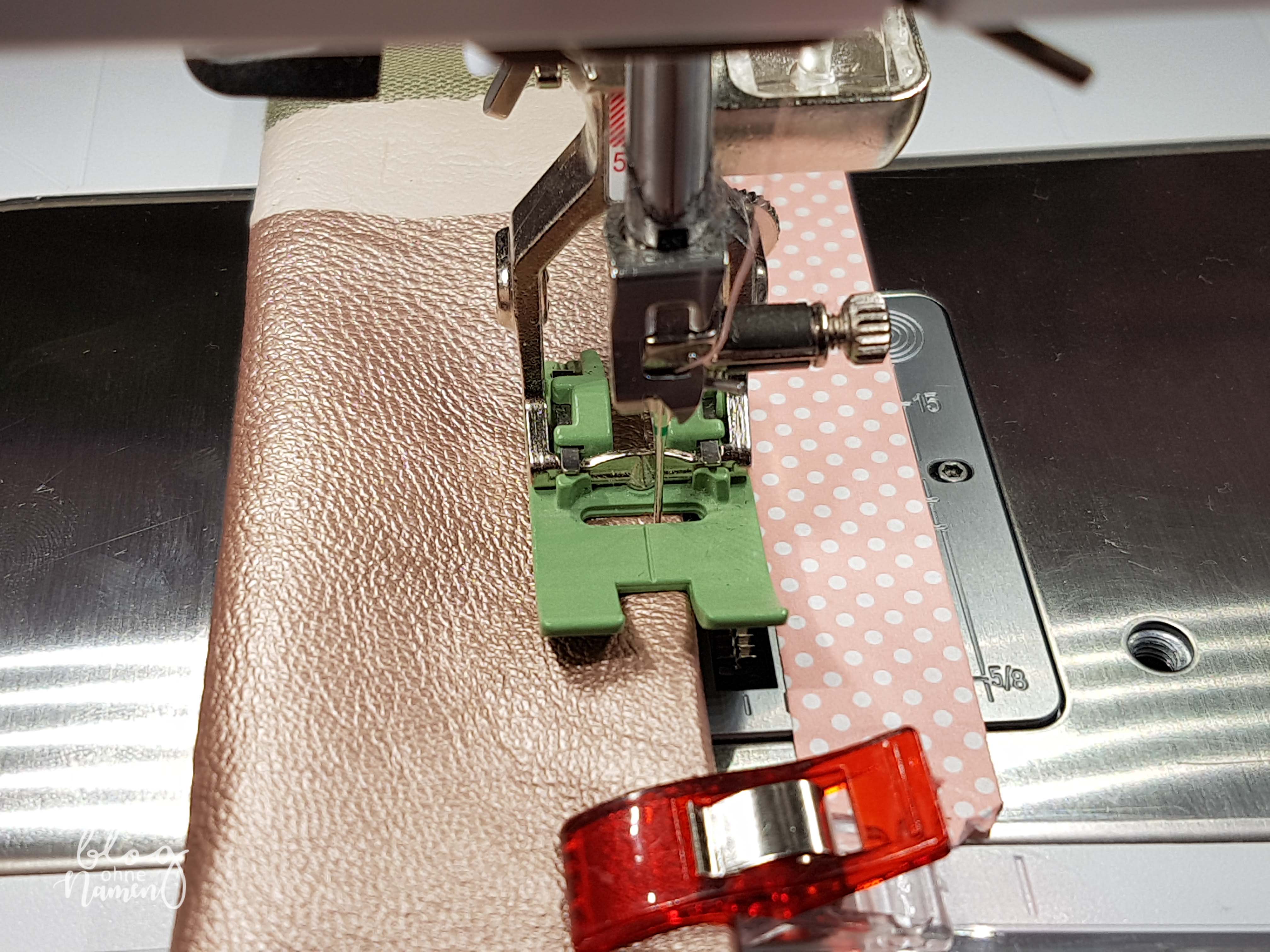 Beim Nähen beginne ich immer an der Seite wo die ganzen Klammern stecken. Meiner Meinung nach erzielt man so das beste Ergebnis, denn die „offene“ Seite wird als erstes geschlossen und ein Verzug während des Nähens ist nur noch schwer möglich. Trotzdem solltet Ihr darauf achten, dass sich nichts „verdrehen“ oder verschieben kann. Damit die Nähte ordentlich werden, nehme ich hier einen Teflonfuß zur Hilfe. So habe ich eine gute Sicht auf das Nähgut und das Füßchen bleibt nicht am Material kleben.