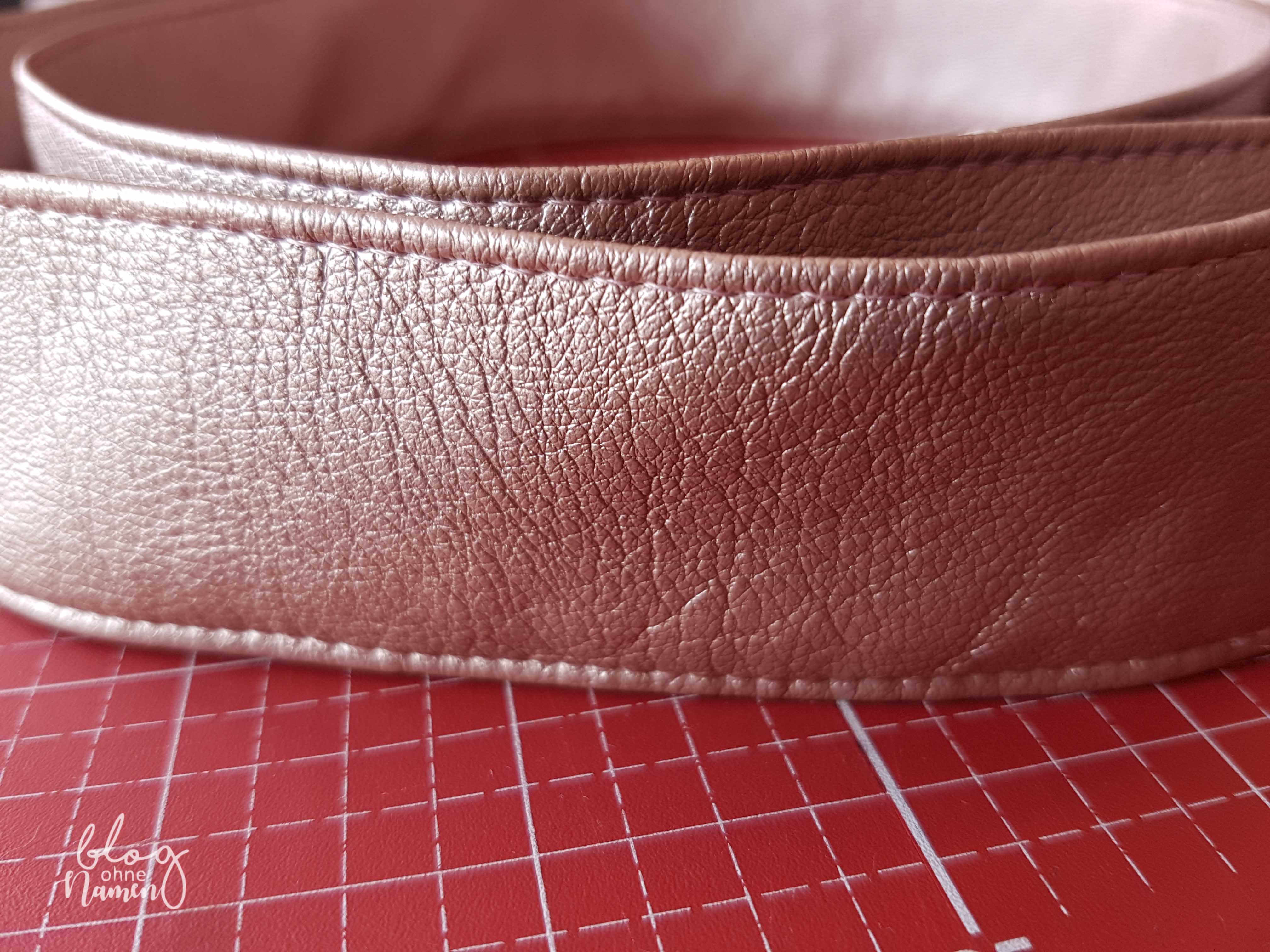 Nachdem die erste Seite fertig ist, kann noch die andere abgesteppt werden. Fertig ist der Träger aus Kunstleder. 🙂