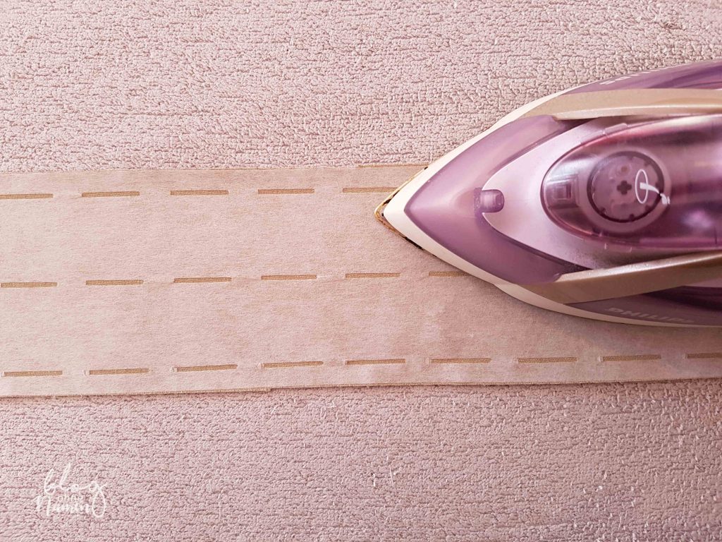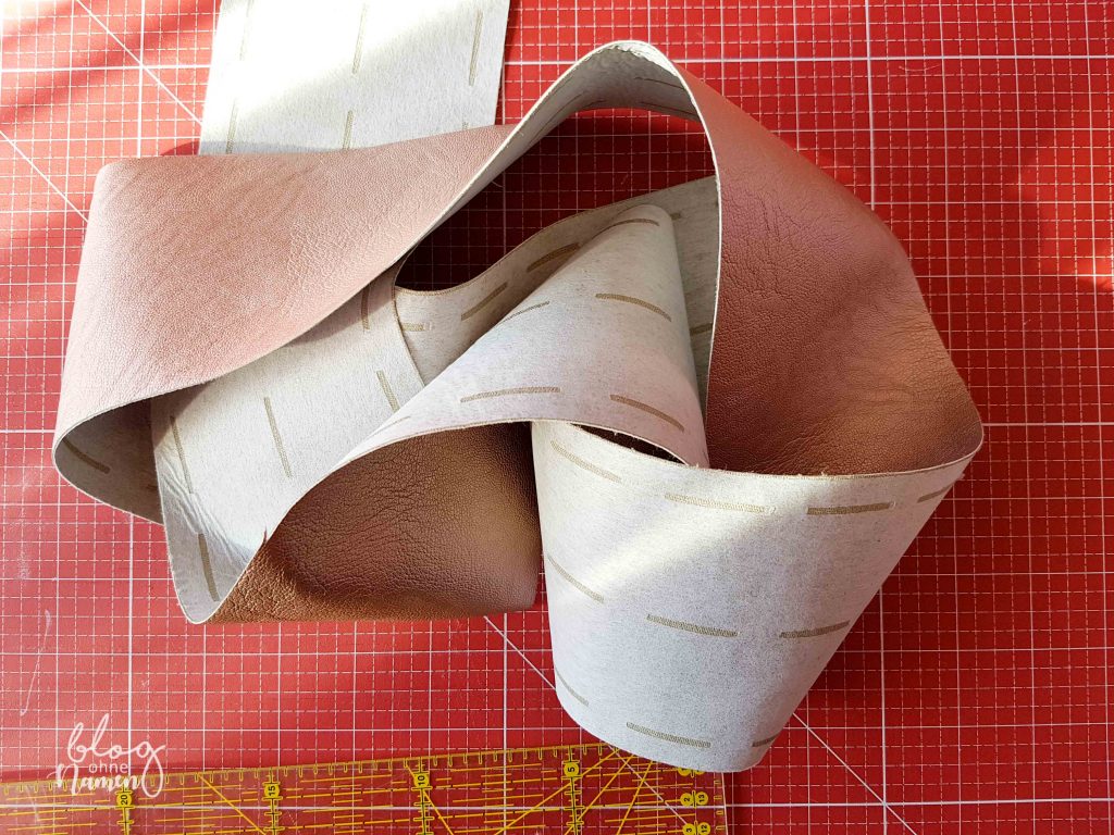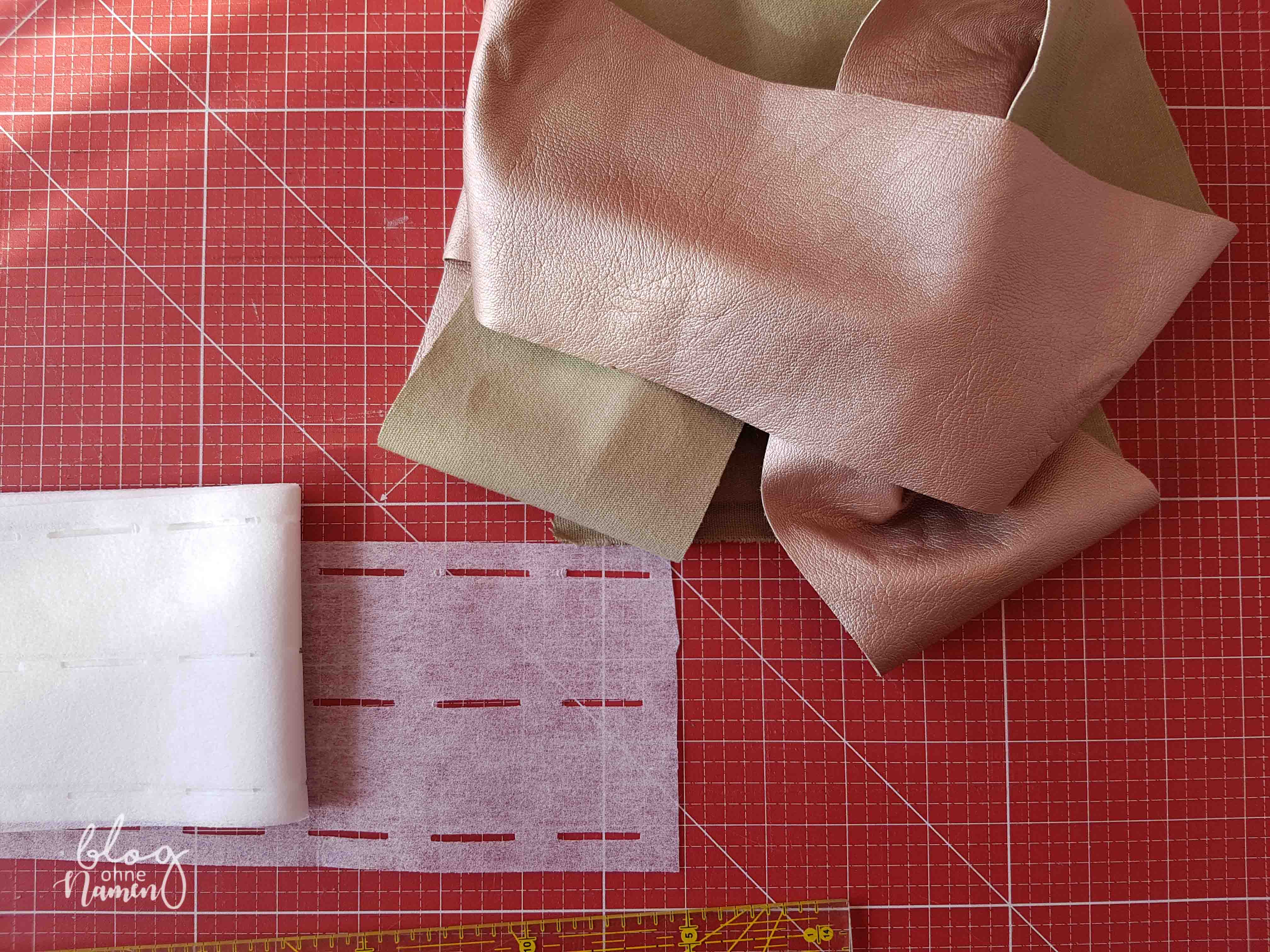 Damit sich später beim zusammennähen das Vlies nicht von dem Kunstleder löst, achte ich hierbei immer besonders darauf, dass an den Kanten gut gebügelt worden sind. Bei mir löst es sich, wenn es das tut, hier am ehesten. Das kann während des Nähens des Trägers dann schon ziemlich nervig werden.