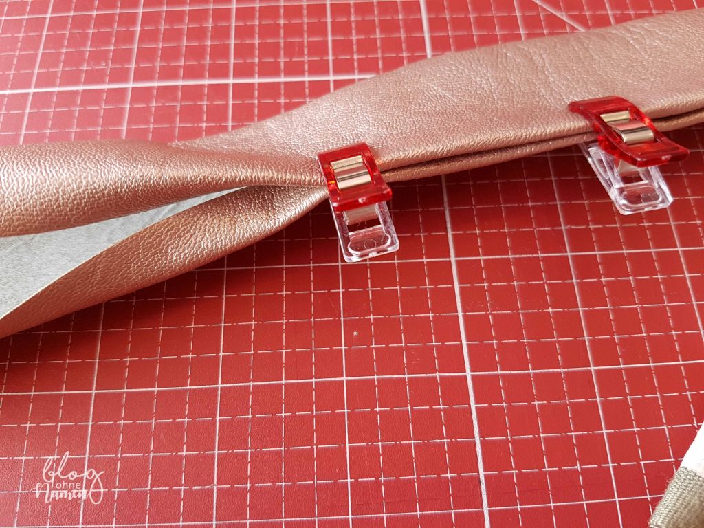 Damit ich beim „Falten“ der Nahtzugaben nicht ganz so viel Fummeln muss, klappe ich eine Seite immer komplett um und befestige diese mit Stoffklammern. Die andere Seite kann dann ganz einfach, Stück für Stück,