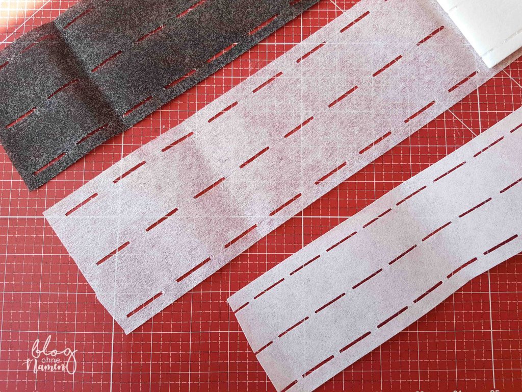 Erst einmal musste ich auf die Suche nach den passenden Breiten des Stanzbandes gehen. Die Verkaufseinheiten bei Vlieseline belaufen sich auf: 10-25-25-10 (fertiger Träger: 2,5 cm) & 10-30-30-10 (fertiger Träger 3 cm). Für die breiteren Maße habe ich die Vliese von Polimex entschieden. Diese gibt es in ganz verschiedenen Verkaufseinheiten.