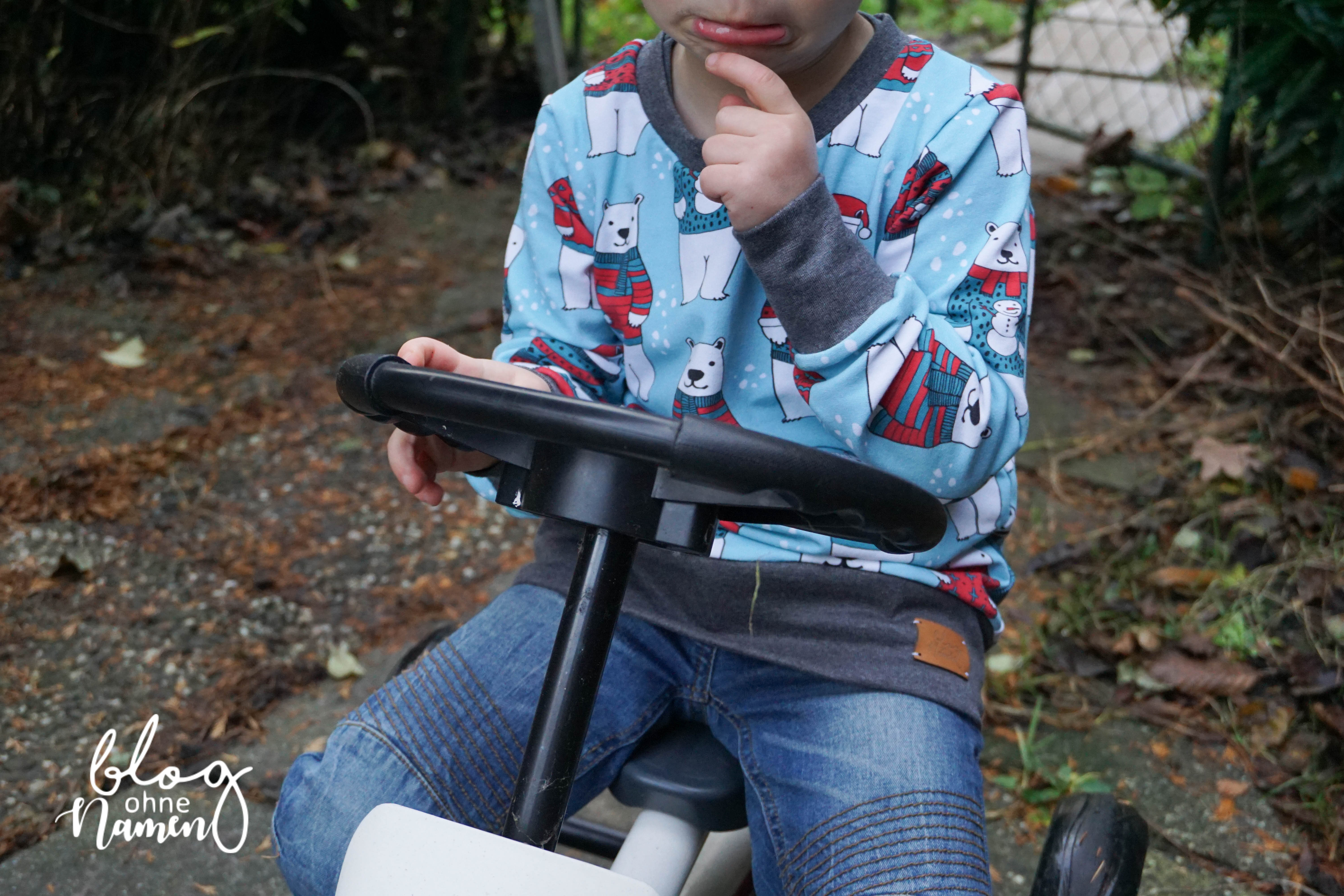 Seit einigen Monaten ist es auch nicht mehr ganz so einfach den Zwerg vor die Kamera zu bewegen. Die Bereitschaft war nun eine ganze Weile quasi bei Null. Um so mehr hat es mich gefreut, dass wir vor ein paar Tagen den perfekten Moment gefunden haben um einen der neuen Pullover zu knipsen. Man darf ja auch mal Glück haben, nicht wahr? 🙂