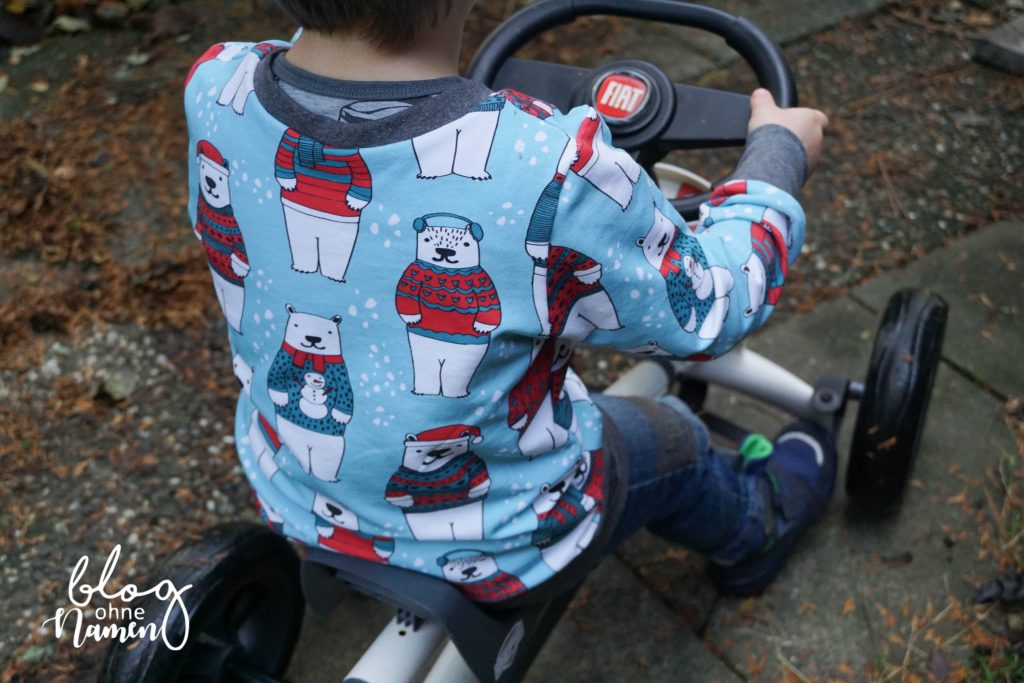 Heute soll es aber um den/die neuen Pullover unseres Rabauken gehen. Der hat vor einiger Zeit nämlich wieder einen Schuss gemacht und stand plötzlich mit viel zu kurzen Shirts, Pullovern, Unterhemden und Hosen da. Glücklicherweise hatte ich einige Tage zuvor neue Stoffe bei Alles für Selbermacher bestellt und konnte direkt in die Produktion gehen.