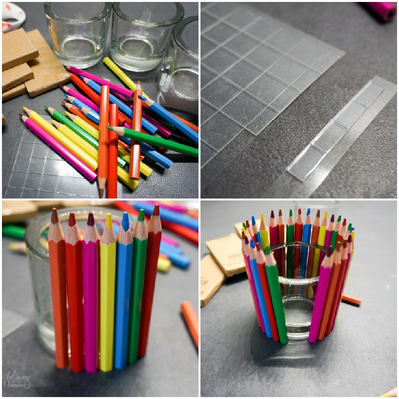 Die ersten Versuche habe ich mit einem doppelseitigem Klebeband gemacht. Das war ein Rest von irgendeinem anderen Projekt und hat, gelinde gesagt, so gar nicht funktioniert. Die Buntstifte sind mir immer wieder vom Glas gefallen und haben teilweise die Farben der Griffe abgerissen. Da es mir aber wichtig war, dass man die Stifte später noch problemlos benutzen kann und das Glas nicht völlig zugekleistert wird, habe ich nach einer anderen Lösung gesucht.
