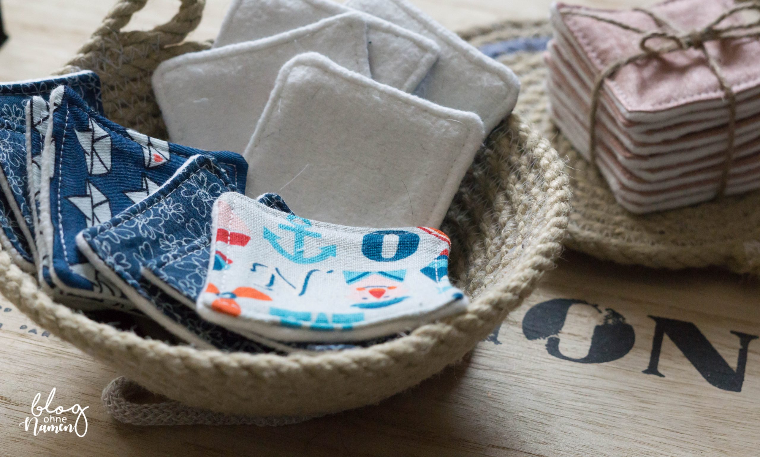 Gefüllt wurde das Körbchen mit waschbaren Abschminkpads. Diese sind aus einigen Stoffresten sowie einem alten Molton – Matratzenschutz entstanden. Um die Pads bei einer hohen Temperatur waschen zu können, wurden beide Materialien bei 90 Grad vorgewaschen. So ist gewährleistet, dass später nichts einlaufen kann. Alternativ hätte man auch zu Meterware* greifen können – aber, was man da hat, hat man da.